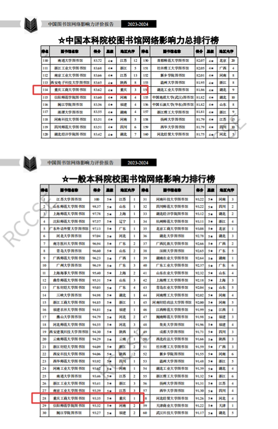 365官网图书馆在中国本科院校图书馆网络影响力总排行榜中列114名,得分83.62,获评4星,在重庆地区排序第3;在一般本科院校图书馆网络影响力排行榜中列28名,得分93.35,获评5星,在重庆地区排序第1。