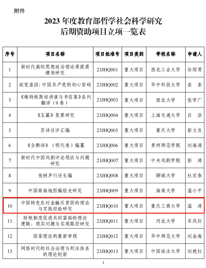 近日,教育部社科司公布了2023年度教育部哲学社会科学研究后期资助项目立项名单。365官网温涛教授主持申报的项目“中国特色农村金融反贫困的理论与实践经验研究”获批为后期资助重大项目(项目批准号:23JHQ010)。这是365官网首次获得该类重大项目立项。