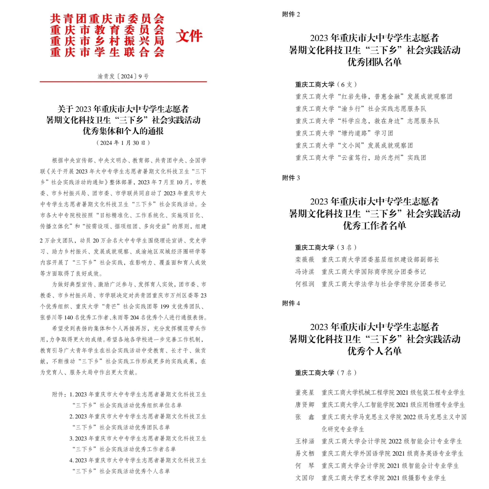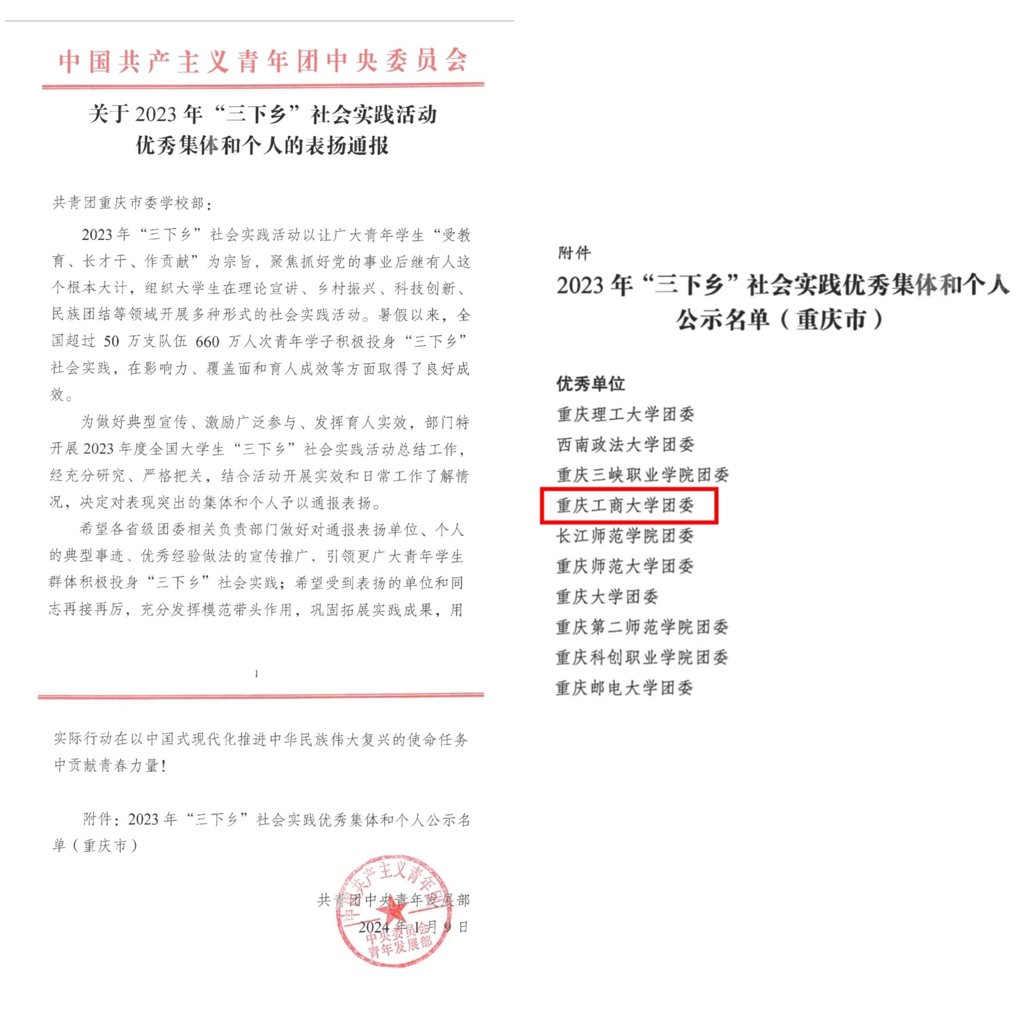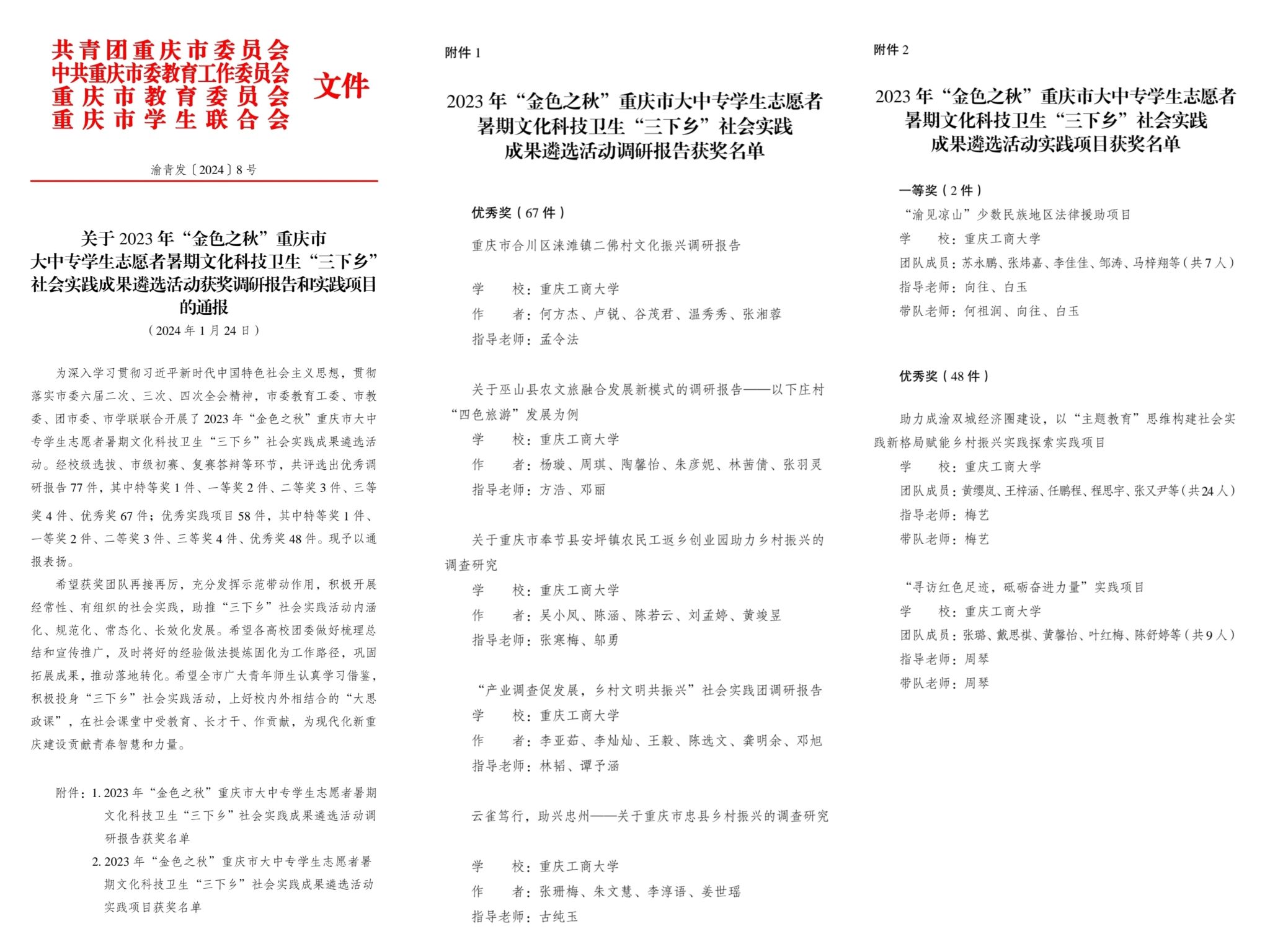 近日,团中央、团市委分别下发《2023年“三下乡”社会实践活动优秀集体和个人的表扬通报》和《关于2023年重庆市大中专学生志愿者暑期文化科技卫生“三下乡”社会实践活动优秀集体和个人的通报》《关于2023年“金色之秋”重庆市大中专学生志愿者暑期文化科技卫生“三下乡”社会实践成果遴选活动获奖调研报告和实践项目的通报》,对2023年社会实践先进集体和个人进行表彰。365官网暑期“三下乡”社会实践工作取得丰硕成果,获得国家级荣誉表彰16项,市级荣誉表彰24项。