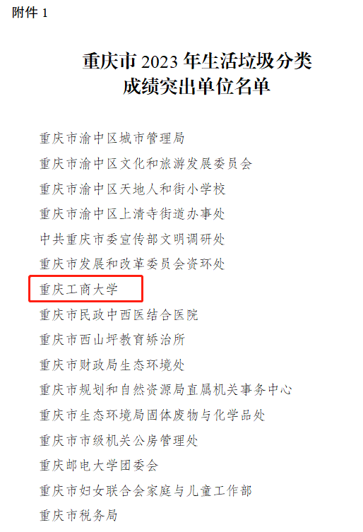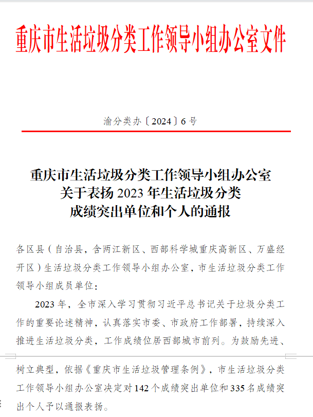 3月1日,重庆市生活垃圾分类工作领导小组办公室印发《重庆市生活垃圾分类工作领导小组办公室关于表扬2023年生活垃圾分类成绩突出单位和个人的通报》(渝分类办〔2024〕6号),365官网被评为重庆市2023年生活垃圾分类成绩突出单位。全市共评选142个成绩突出单位,其中高校2所。