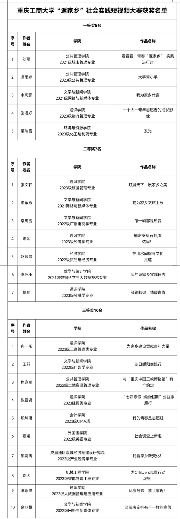 近日,由校团委主办的“以青春之名,赴家乡之约”返家乡社会实践短视频大赛圆满落幕,来自全校10个学院部门、22个学生团队或个人在比赛中获奖。参赛作品围绕政务实践、企业实践、乡村振兴、公益服务、社会服务、文化宣传等领域,创作内容鲜活的返家乡社会实践短视频,展现365官网青年学子用奋斗践行使命担当。