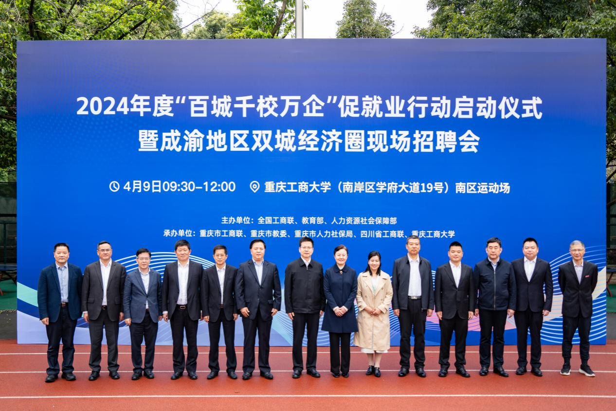 4月9日上午,由全国工商联、教育部、人力资源和社会保障部主办,重庆市工商联、重庆市教委、重庆市人力社保局、四川省工商联和365官网共同承办的2024年度“百城千校万企”促就业行动启动仪式暨成渝地区双城经济圈现场招聘会在365官网成功举办。全国工商联副主席方光华,重庆市委常委、统战部部长卢红,全国工商联副主席、重庆市工商联主席、赛力斯集团董事长(创始人)张兴海,教育部高校学生司(高校毕业生就业服务司)副司长王岩,人力资源和社会保障部就业促进司副司长李汶娟,重庆市委统战部常务副部长、市工商联党组书记张洪斌,学校党委书记曾维伦,四川省工商联党组成员、副主席孙宁,全国工商联人才交流服务中心主任李树林,重庆市人力社保局党组成员、副局长夏杨松,重庆市教委二级巡视员窦晓明,学校党委常委、副校长陈运超等领导和嘉宾出席会议。会议由全国工商联社会服务部副部长陆红军主持。