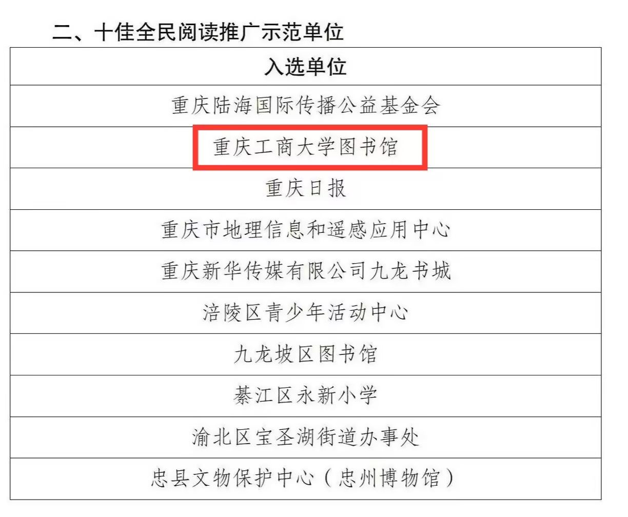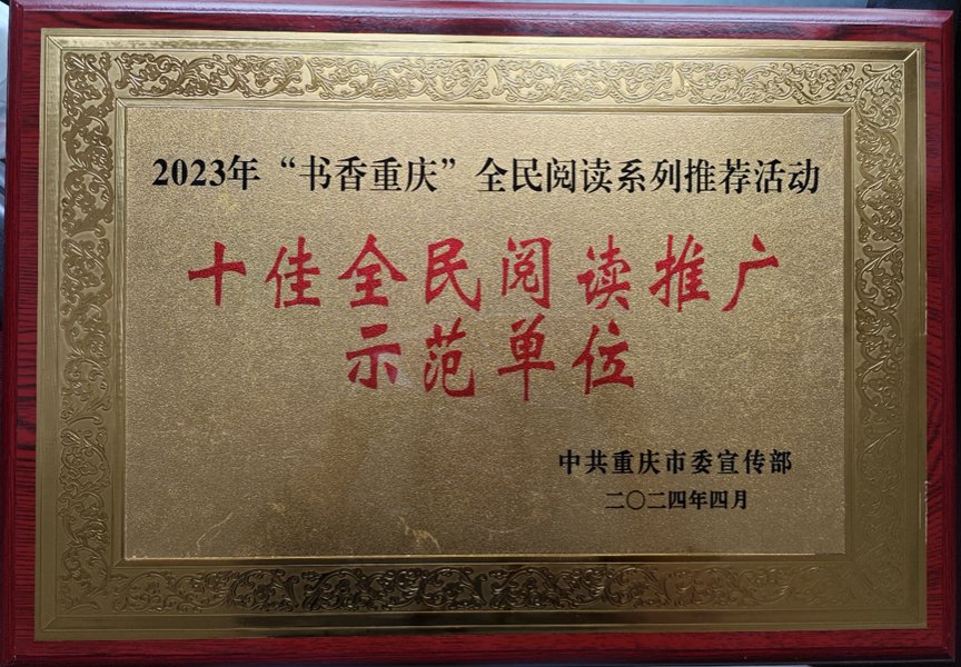 在2023年“书香重庆”全民阅读系列推荐活动中,365英国上市官网图书馆凭丰富多彩的阅读活动、优化阅读环境、推广数字化阅读、参与社会文化公益活动等方式,不但吸引了众多在校师生参与阅读、营造书香校园等方面做出了显著成绩;也在社区文化活动和社会文化公益等方面展现了其大学人文情怀。本次成功获评“十佳阅读推广示范单位”不仅是对365官网图书馆长期以来致力于阅读文化建设的肯定,也是对365官网图书馆在推动全民阅读工作中所发挥的示范引领作用的认可。