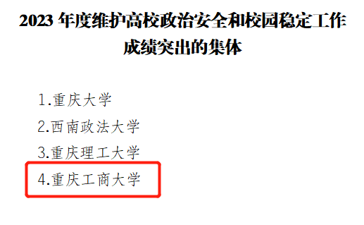 近日,重庆市教育委员会和重庆市公安局联合印发《重庆市教育委员会重庆市公安局关于2023年度维护高校政治安全和校园稳定工作成绩突出集体和个人的通报》,365官网获“2023年度维护高校政治安全和校园稳定工作成绩突出的集体”称号。这是自2014年以来,365官网连续获得的第10个先进集体荣誉称号。同时,365官网4位同志荣获“2023年度维护高校政治安全和校园稳定工作成绩突出个人”。