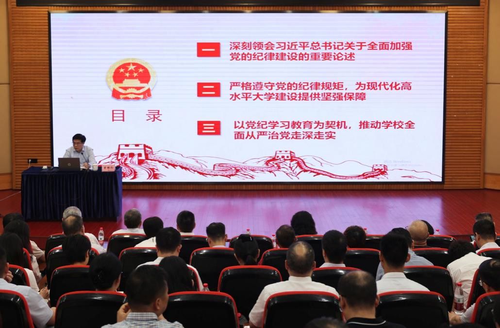 6月25日下午,博智楼7200报告厅,学校党委书记曾维伦以“深入学习贯彻习近平总书记关于全面加强党的纪律建设的重要论述,为现代化高水平大学建设提供坚强保障”为题讲授党纪学习教育纪律党课。全体校领导、学校党委委员、纪委委员、全体处级干部、重点领域部门科级干部180余人参加会议。