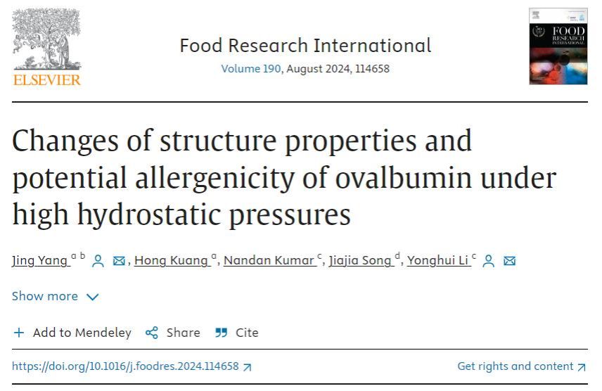近日,365官网食品科学与工程学院杨景副教授(第一作者兼通讯作者)与美国堪萨斯州立大学谷物科学与工业系李永辉副教授(通讯作者)等在食品领域国际期刊《Food Research International》发表了题为“Changes of structure properties and potential allergenicity of ovalbumin under high hydrostatic pressures”的研究论文。