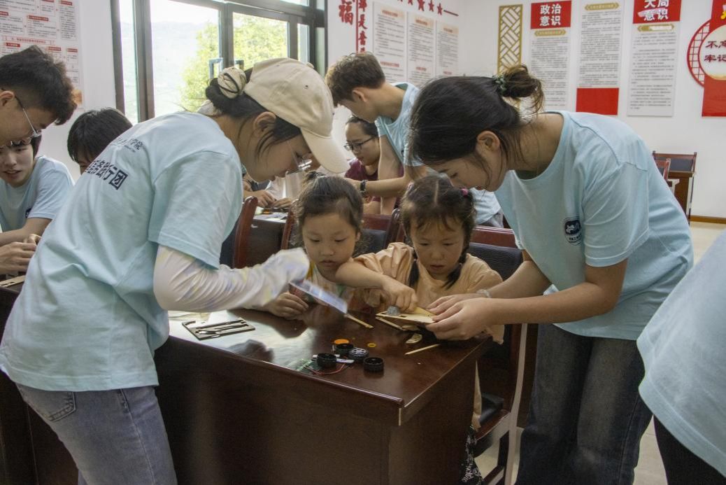 7月17日上午,通识学院“华韵传承,民俗‘酉’新”中华文化传承团前往重庆市酉阳县铜鼓镇兴隆村,面向当地青少年儿童开展以“赓续非遗文脉,绽放时代新韵”为主题的爱心支教活动。支教过程中,实践团成员以兴隆村发展历史为切入点,开展中华文化和非遗文化特色课程。从土司文化到乡村建设,从阳戏到土家摆手舞,深刻地展示兴隆村深厚的历史底蕴和独特的非遗文化。课堂上,实践团成员声情并茂地介绍非遗文化传统,激起少年儿童对中华优秀传统文化的浓厚兴趣。活动最后,实践团成员现场演示非物质文化遗产——漆扇的制作步骤及技巧,指导小朋友体验漆扇制作技艺,近距离感受非遗文化魅力。
