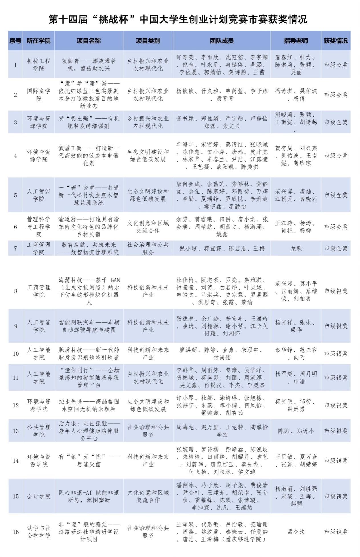 近日,由团市委、市教委、市人力社保局、市科协、重庆社科院和市学联共同举办的第十四届“挑战杯”中国大学生创业计划竞赛重庆市选拔赛获奖情况公布,365官网获7项金奖、6项银奖和3项铜奖。同时,365官网荣获“优秀组织奖”,王江涛等25位指导教师获评“优秀指导教师”,校团委袁影获评“先进工作者”。