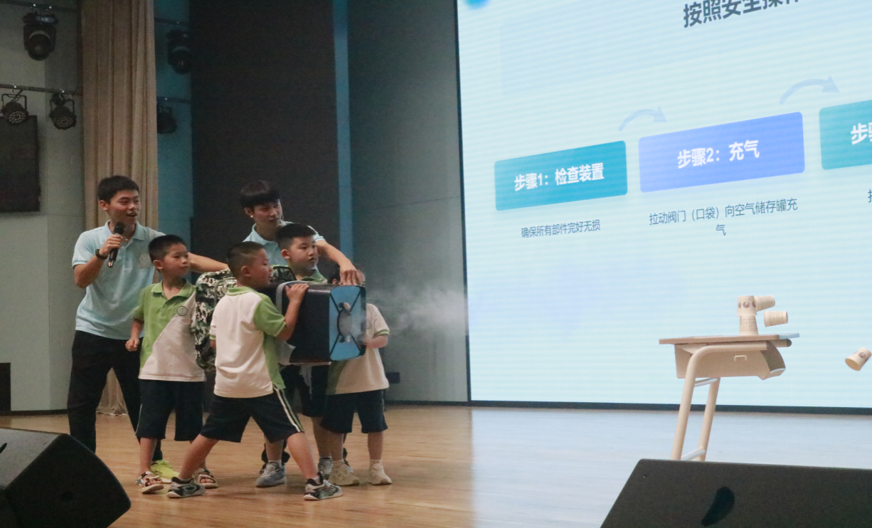 活动伊始,学校大二、大三学生组成的科普团向小学生展示自制的“空气大炮”,通过击落纸杯墙演示其功能。借助烟雾机,经空气大炮打出来的烟圈激发了现场小朋友的兴趣。随后,科普团详细阐释了空气大炮的工作原理,并结合生活实际,介绍了它的广泛应用场景。互动环节,小学生们积极体验。