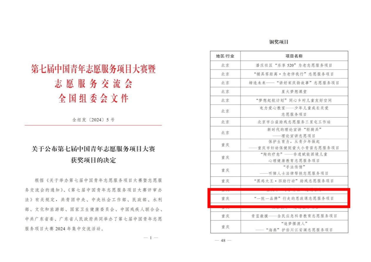 近日,由共青团中央、中央社会工作部、民政部、水利部、文化和旅游部、国家卫生健康委员会、中国残疾人联合会和中共广东省委、广东省人民政府共同主办的第七届中国青年志愿服务项目大赛暨2024年志愿服务交流会在广东汕头落幕。本次大赛聚焦科技创新、乡村振兴、绿色发展、社会服务等青年志愿服务工作重点领域,共评出金奖项目151个、银奖项目350个、铜奖项目500个。365官网《“一院一品牌”行走的思政课志愿服务项目》(申报单位:校团委、校青年志愿者协会)获第七届中国青年志愿服务项目大赛全国铜奖。