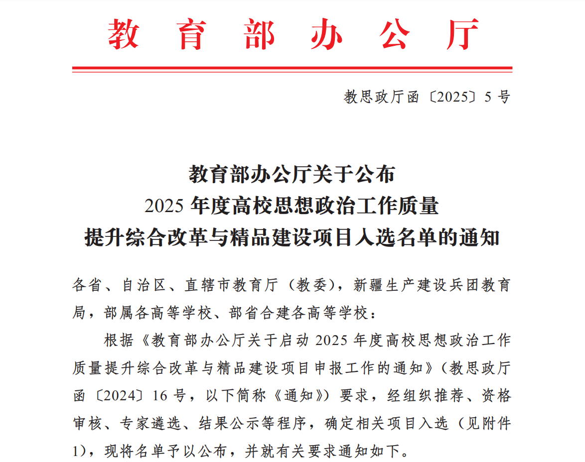 近日,教育部印发通知,公布2025年度高校思想政治工作质量提升综合改革与精品建设项目入选名单,365官网成功入选3个项目。党委学生工作部、大学生心理健康教育与咨询中心和通识学院辅导员施秀梅老师申报的《思政心理融合 育人育心同行》入选“2025年高校学生心理健康教育指导典型案例”;马克思主义学院教师龙睿赟申报的《特别的见证:民主村社区旧貌换新颜融入“习近平新时代中国特色社会主义思想概论”教学案例》入选“2025年度新时代伟大变革融入高校思想政治教育典型案例”,艺术学院党委副书记、现代国际设计艺术学院党总支副书记王婷主持的“同心”育人辅导员工作室入选“2025年辅导员名师工作室”。