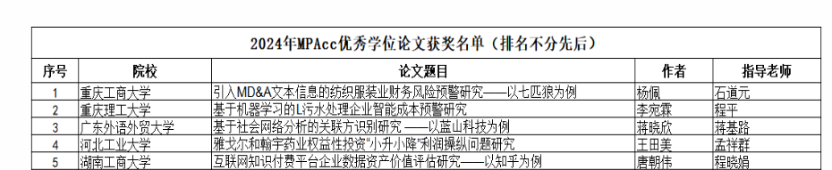 5月7日,全国会计专业学位研究生教育指导委员会公布了2024年MPAcc优秀学位论文奖名单,一共28篇学位论文获奖。365官网会计学院杨佩同学撰写(指导教师:石道元教授)的论文《引入MD&A文本信息的纺织服装业财务风险预警研究——以七匹狼为例》获奖。