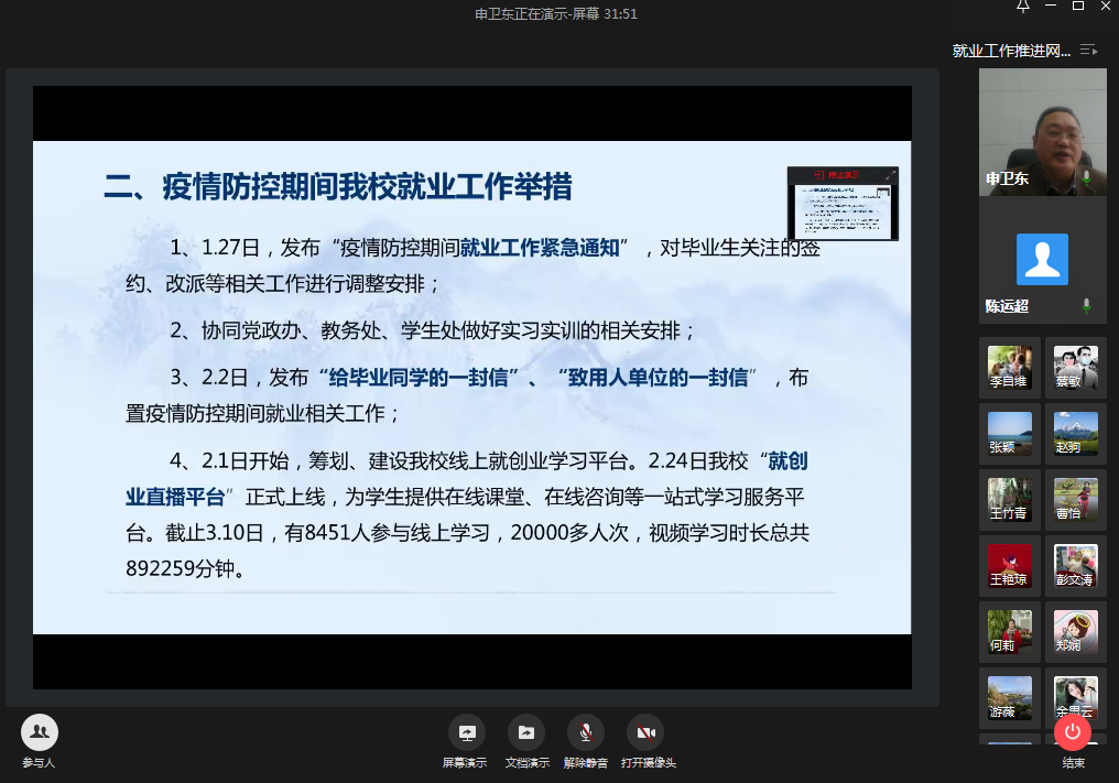 会上,招生就业处申卫东处长传达了重庆市教委就业工作会议的主要精神,通报了疫情防控期间365官网就业工作举措及当前365官网毕业生就业状况,安排了下一步的主要工作,同时结合学院反映的疫情防控期间就业工作中出现的新问题作了回应。