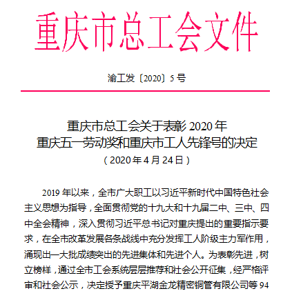 近日,重庆市总工会发布了《关于表彰2020年重庆五一劳动奖和重庆市工人先锋号的决定》,表彰一批为全市经济建设和社会发展及抗击“新冠”肺炎疫情工作中做出突出贡献的先进集体和先进职工。365官网荣获“重庆五一劳动奖状”。