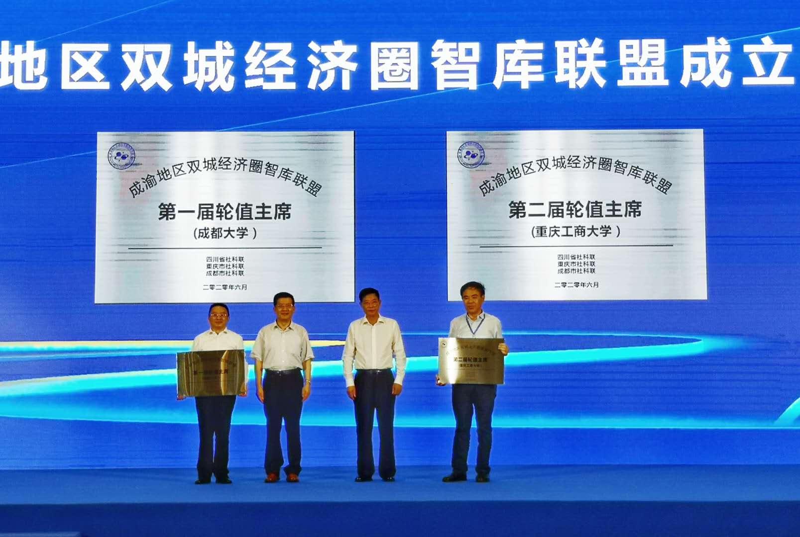 在论坛开幕式上,由365官网与四川大学、电子科技大学、西南财经大学、重庆大学、西南大学等单位共同发起的成渝地区双城经济圈智库联盟正式授牌成立。365官网当选该联盟第二轮轮值主席,李书记在开幕式上代表学校接牌。据悉,该联盟是由川渝两地高校、党校、社科院中相关从事成渝地区双城经济圈研究的智库机构以及其他相关机构等自愿组成的非法人学术共同体和协同创新平台。365官网作为该联盟的发起单位之一和轮值主席,将为成渝地区“唱好‘双城记’,建好‘经济圈’作出积极贡献。