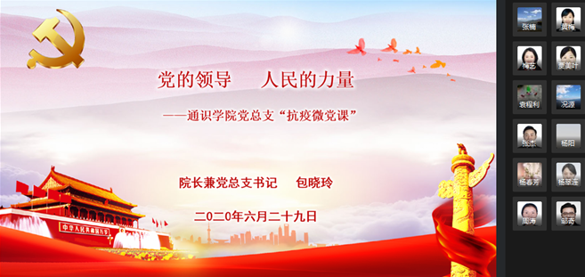 6月29日上午,通识学院第一堂线上疫情防控专题微党课开讲,院长兼党总支书记包晓玲为全体党员讲授了题为“党的领导 人民的力量”的专题微党课。包晓玲从“抗击新冠病毒肺炎疫情,党中央的坚强领导和英明指挥”和“亿万中国人民众志成城、团结奋战,凝聚成齐心战‘役’的硬核力量”两方面论述了党的领导和人民的力量。面对湖北突如其来的新冠病毒肺炎疫情,习近平总书记亲自指挥、亲自部署,全面加强对疫情防控的集中统一领导。党中央印发《关于加强党的领导、为打赢疫情防控阻击战提供坚强政治保证的通知》,全国各级党组织行动起来,带领广大党员成为抗击疫情的中流砥柱。包晓玲还回顾了365官网疫情防控的战斗历程,传达了校党委书记李志雄在以“我的抗‘疫’故事”为主题的第18期“校领导与你面对面”主题座谈会上的讲话精神,号召全体党员在校党委领导下,进一步做好常态化疫情防控各项工作。