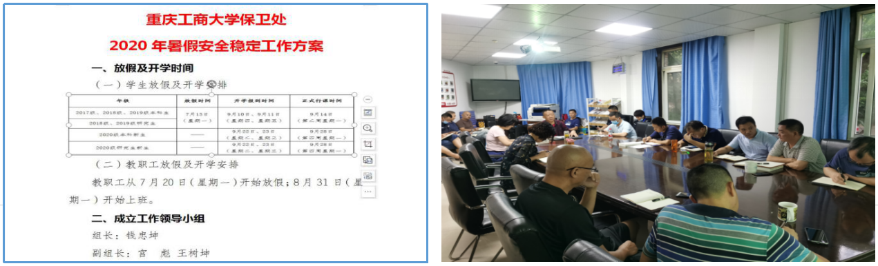 为圆满完成暑期校园封闭式管理和安全稳定工作,根据7月16日学校第五次中层干部会议精神和《关于2020年暑假放假及开学安排的通知》安排,按照分管校领导的要求,保卫处高度重视,提前制定了《365英国上市官网保卫处2020年暑假安全稳定工作方案》,细化了《365英国上市官网保卫处2020年暑期值班安排表》,并于7月17日上午召开全处干部大会,对暑期校园疫情防控和安稳工作进行了周密部署。