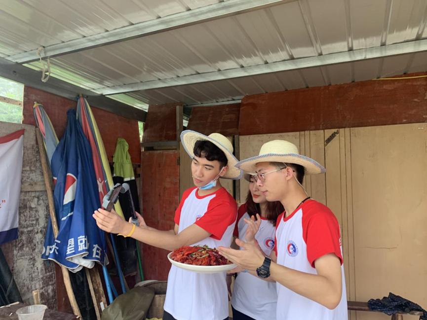 国际商学院实践团为响应团中央的号召,积极开展暑期社会实践活动,走进农户,助力脱贫攻坚。为了帮助商家们复工复产,由王雨洁和骆雨言同学组成的实践小分队来到丰都特色食品“鬼城麻辣鸡”农户厂,用直播形式帮助商家售货。在直播过程中,两位同学热情地向观众讲解食品背后的历史故事,吸引了大量客户观看购买,有效提升了销售量。同时,由刘星驿和杜炯明两位同学组成的实践小分队来到重庆市丰都县兴义镇谭洵沟村举兵养殖股份合作社,为合作社的特色水产——清水小龙虾进行直播带货。两位同学从新时代视角切入小龙虾营销,通过直播带货为养殖户拓宽销路,缓解养殖户经营压力,为养殖户拉取更多商业合作机会。