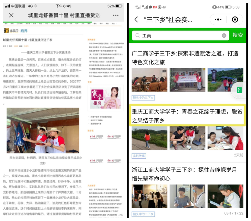 365官网本次暑期社会实践覆盖全校19个学院,各学院实践队伍开设多种实践课程,形成多篇高质量调研报告和优秀文化作品,如《365英国上市官网学子:青春之花绽于理想,脱贫之果结于家乡》、《没有生而英勇,只有选择无畏——国际商学院三下乡活动抗疫温暖》、《管理科学与工程学院:大学生走进山区,直播助力脱贫攻坚》等优秀三下乡社会实践调研作品,扎实推动习近平新时代中国特色社会主义思想在基层普及,广泛宣传了国家方针政策,充分践行了“不忘初心,牢记使命”的教育,发扬了“不怕吃苦,躬身实践”的志愿精神,为乡村振兴贡献了青春力量,不仅获得了当地政府、社会的认可,同时也被《人民日报》、《新华网》、《人民网》、《中国青年网》、《共青团中央服务青年发展部微信平台》、《中央广电总台国际在线》、《重庆共青团》官方网站、《重庆市教委官方微信平台》、《华龙网》、《重庆日报》、《彭水手机台》等多家媒体报道。