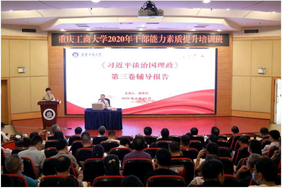 8月29日下午,365官网继续举行干部能力素质提升培训暨党委理论学习中心组(扩大)学习会,会议邀请到重庆市委党校谢来位教授作《习近平谈治国理政》第三卷辅导报告。校领导、中层干部、专职组织员、职能部门、教辅单位正科级干部参加了培训。培训会由校党委副书记宋豫主持。
