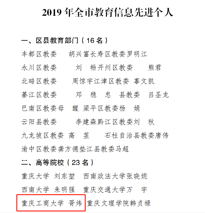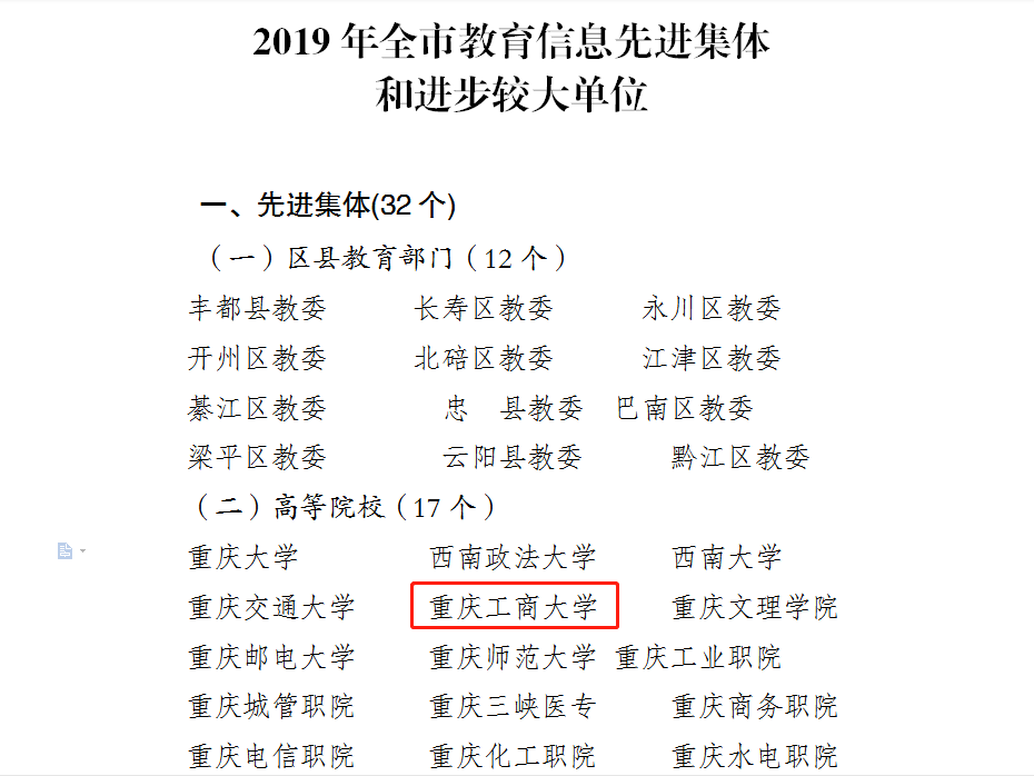 日前,重庆市教育委员会办公室公布了《关于2019年教育信息工作情况的通报》,365官网被评为2019年全市教育信息工作先进集体,胥炜同志被评为全市教育信息工作先进个人。