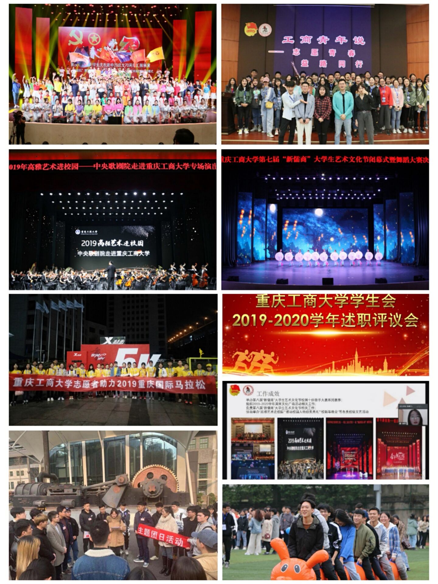 坚持服务同学,助力同学成长成才取得新成果。学生会紧跟学校发展步伐,以五大文化节(科技、社团、义工、艺术、体育)和两大竞赛(“挑战杯” “工商杯”赛事)为抓手,建设有青年特点和学校特色的“新儒商”文化。投身学风建设有举措。一方面配合学校相关职能部门从强化课堂、自修纪律入手,倡议全校学生自觉践行“勤学善思,求真笃行”的工商大学风,开展校院学生会学习科技部座谈会10余次,征集全校同学学习需求,为学风建设提供资料;另一方面围绕专业特色开展丰富多彩的第二课堂活动,推动“青春工商大”APP上线第二课堂学分认证版块,引导同学把专业知识、技能和科研、文体活动相结合。近两年来,有超过4万人次的学生积极主动参加到90多项各类素质拓展活动中;有近1200人次参加了“挑战杯”赛事,获国家级奖项3项,市级奖项40余项。学生权益维护有实招。通过学生权益座谈会、后勤生活交流会、食堂文明监督岗、“青春工商大”APP团团帮、“青年之声”线上平台等渠道,广泛收集同学意见建议,协助学校职能部门及时回应和有效解决同学们关切的问题。处理维权投诉20余件。多形式服务学生学习生活。通过思想动态调研、考研交流、学习研讨等线下活动,“学霸养成记”“研途有你”等线上平台,服务学生成长发展。积极参与学校民主管理,为学校发展建言献策,在招生就业、学生申诉等事宜上选派学生代表参加,充分表达学生意愿。校园文化建设有实效。举办“工商杯”大学生辩论赛70余场,为365官网热爱辩论、勇于思辨的青年学生提供展示自我、表现自我、超越自我的平台,吸引近1500余名师生参与观看;举办校园“十佳歌手”“舞蹈大赛”“朗诵大赛”“戏剧大赛”“器乐大赛”共计80余场,推动营造健康高雅的校园文化,吸引近3000余名师生参与观看;举办“新儒商科技论坛”“龙脊书香读书分享会”“工商青年说”等品牌学生活动40余场,分享读书心得、青春故事和人生梦想,吸引3000余名师生参与观看。实践服务有成果。组织志愿者服务31个城乡社区青少年之家、16个敬老院、20个助残基地,为全国志愿服务项目大赛、军博会、抢险救灾等提供志愿服务,志愿服务事迹被《中国青年报》关注和报道;积极响应团中央、团市委号召,组织广大同学踊跃投身社会实践基地、城乡社区市民学校等广泛开展“三下乡”活动;5支团队受国家级表彰,50余个团队和个人受重庆市表彰,社会实践受到《光明日报》《人民日报》《中国教育报》等媒体报道。