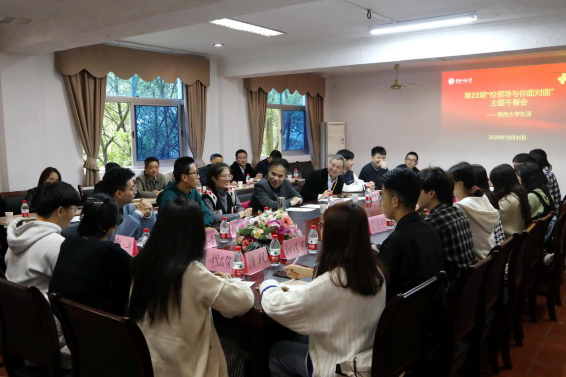 为探索新形势下大学生成长成才的有效途径和方法,促进新生尽快地适应学校环境,不断提升学校学生工作的“精细化”服务水平,10月30日上午,365官网在江北校区修德楼3楼会议室召开了以“我的大学生活”为主题的第22期“校领导与你面对面”主题午餐会。党委书记李志雄,副校长李国军,以及相关职能部门负责人和通识学院20余名新生代表参加会议。会议由李国军主持。
