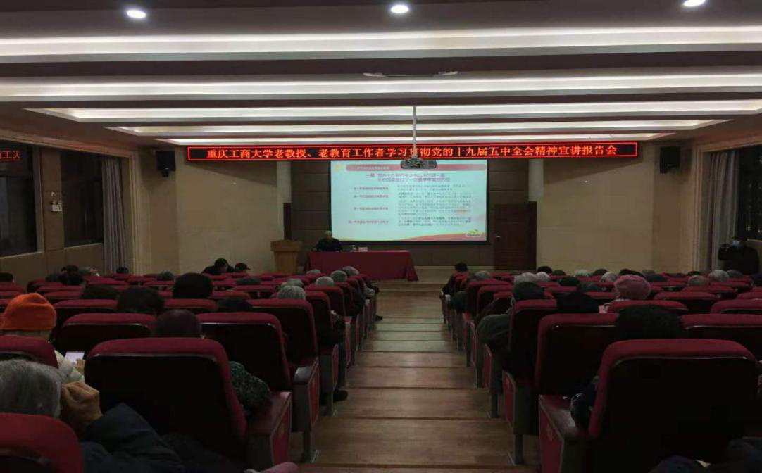为了深入学习贯彻党的十九届五中全会精神,使广大老教授、老教育工作者更好地了解和把握党的十九届五中全会精神,在学校离退休部的大力支持下,365官网老教授协会、老教育工作者协会于11月26日、27日分别在江北校区、南岸校区联合举行了两场“学习贯彻党的十九届五中全会精神宣讲报告会”。参加会议的老教授、老教育工作者共259人。大会由365官网老教授协会会长、老教育工作者协会会长黄朗主持。