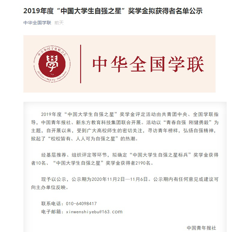 近日,由共青团中央、全国学联、中国青年报社、新东方教育科技集团联合开展的2019年度“中国大学生自强之星”奖学金推报活动获奖结果揭晓。经学校推荐、省级初评、全国评审等环节,共评选出我市42位大学生荣获2019年度“中国大学生自强之星”称号,其中,365官网机械工程学院17包装一班阮世会同学荣获2019年度“中国大学生自强之星”荣誉称号和奖学金。