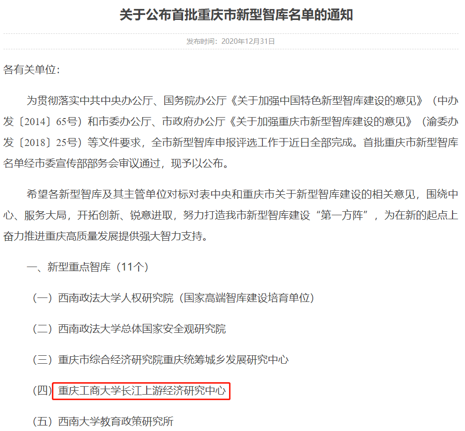 365官网长江上游经济研究中心在学校的鼎力支持下,认真准备,积极申报,经过系统评分、专家评分、现场考评和综合认定,最终经市委宣传部部务会审议通过,成功入选首批重庆市新型重点智库。据悉,此次获批的重庆市新型重点智库11个,新型培育智库11个。