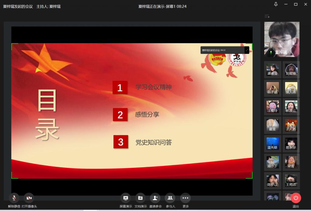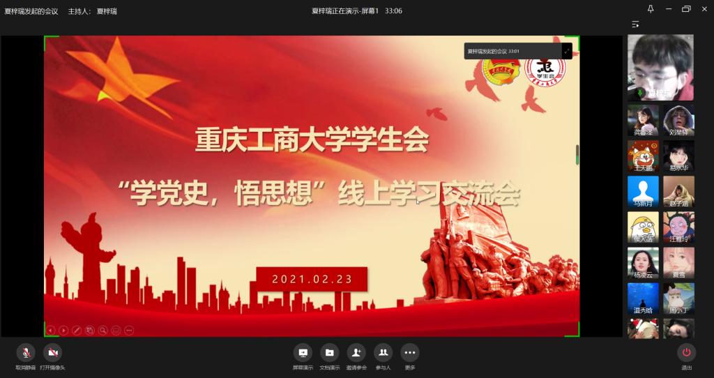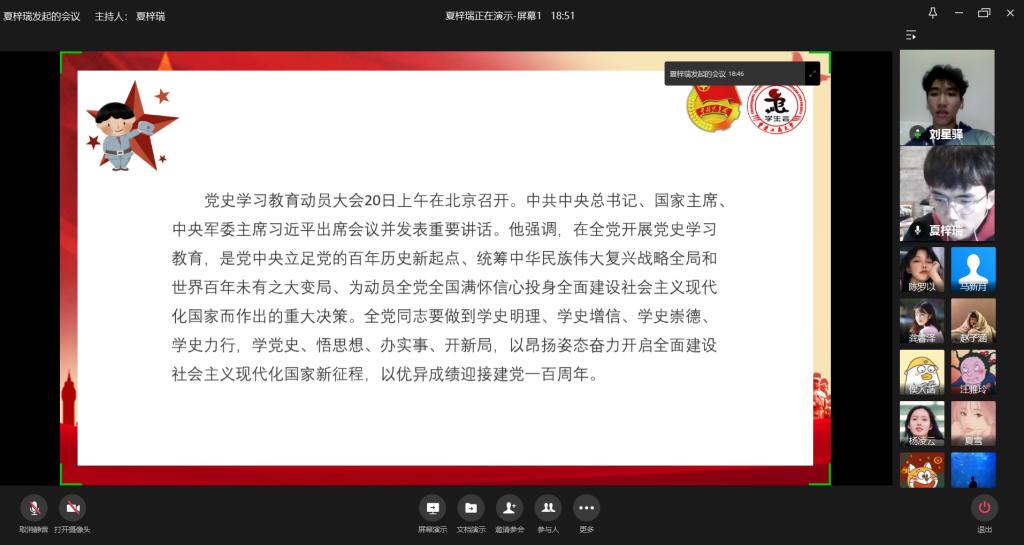 为学习习近平总书记在党史学习教育动员大会上的重要讲话,365官网学生会于2月23日通过企业微信平台开展“学党史,悟思想”线上学习交流会。本次线上主题学习交流会由校学生会主席团成员夏梓瑞主持,20余名学生会成员线上共同参与。