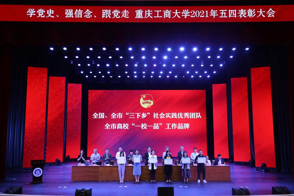 随着庄严的国歌响起,大会正式拉开序幕。大会首先由校团委书记杨娟宣读《共青团365英国上市官网委员会关于表彰2020-2021学年先进集体和个人的决定》,随后为获奖集体和个人代表进行颁奖,颁发奖项包括全国、重庆市社会实践活动优秀团队、重庆市高校“一校一品”优秀团学工作品牌、五四红旗团委、共青团特色创新奖、宣传工作奖、五四红旗团支部、优秀学生会、优秀义工志愿者协会、优秀分团委书记、共青团标兵、优秀团干部、优秀团员及校级“挑战杯”等奖项。