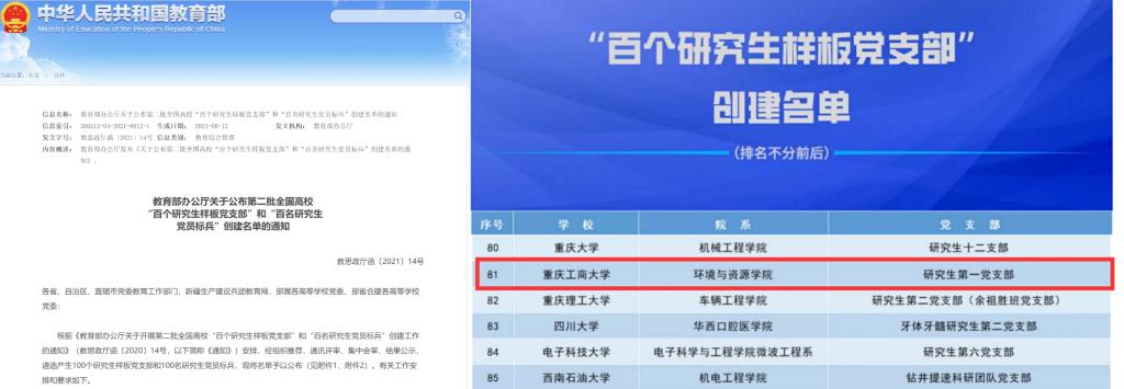 近日,教育部发布《关于公布第二批全国高校“百个研究生样板党支部”和“百名研究生党员标兵”创建名单的通知》,365官网环境与资源学院研究生第一党支部成功入选,这是继365官网连续两批成功获批“全国党建工作样板支部”后,获得的又一殊荣。目前,重庆市共有3个高校研究生党支部入选。