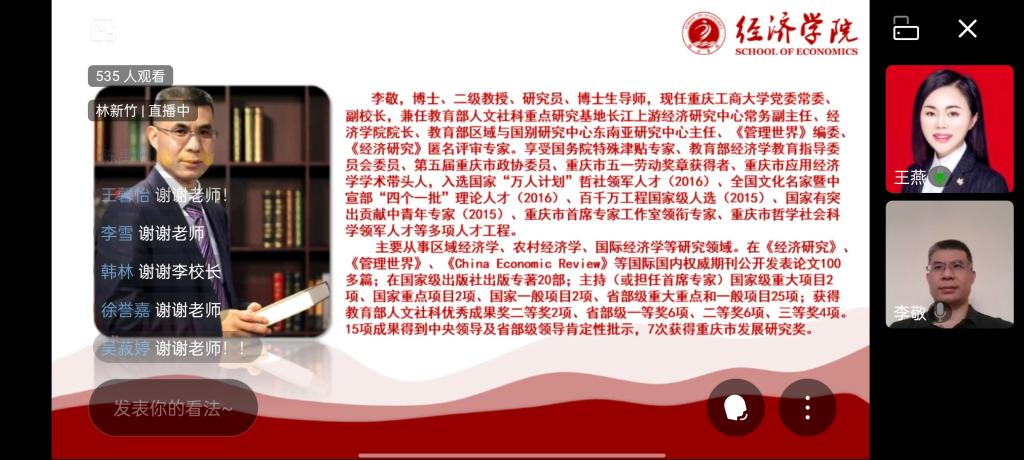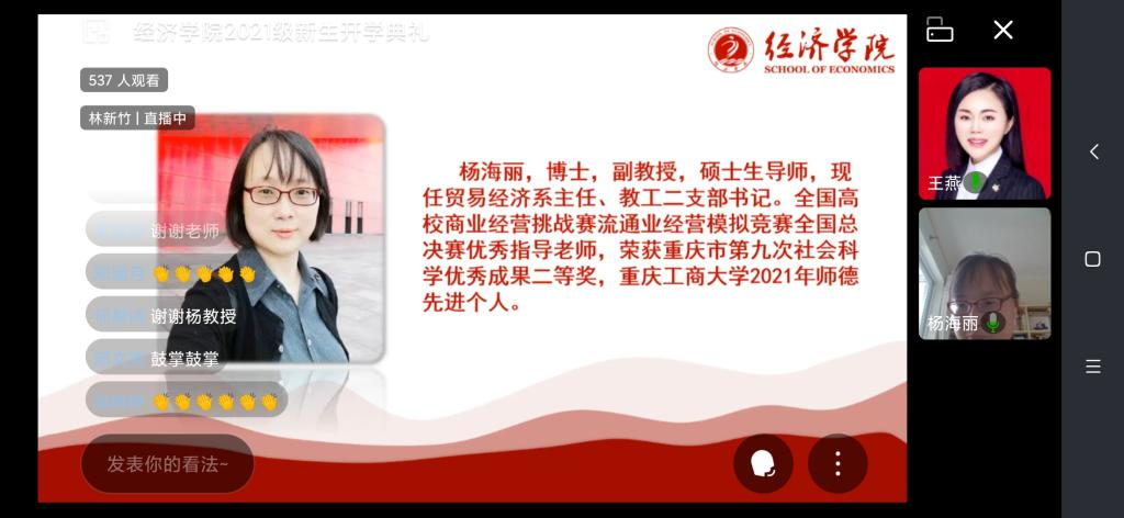9月11日上午,经济学院2021级新生入学专业教育线上直播成功举行。副校长、经济学院院长李敬出席典礼,经济学院班子成员、系主任、辅导员、2021级50名研究生参加了会议。会议由经济学院党委副书记、副院长王燕主持。