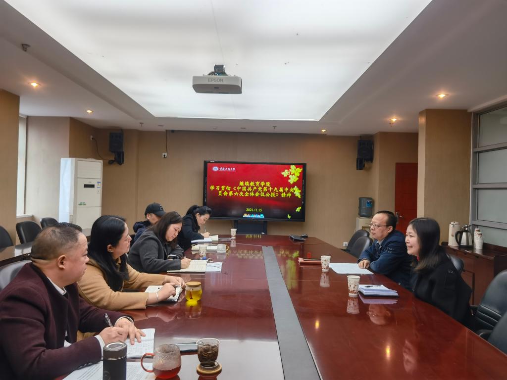 为了深入学习宣传贯彻党的十九届六中全会精神,牢牢把握正确政治方向,推动党史学习教育深化拓展。继续教育学院于11月15日组织全院教职工在南岸校区和江北校区开展了党的十九届六中全会精神专题学习会,南岸校区会议由学院党总支书记石世明主持,江北校区由谢泽文老师主持,院长杜朝辉和全体教职工参加了学习会。