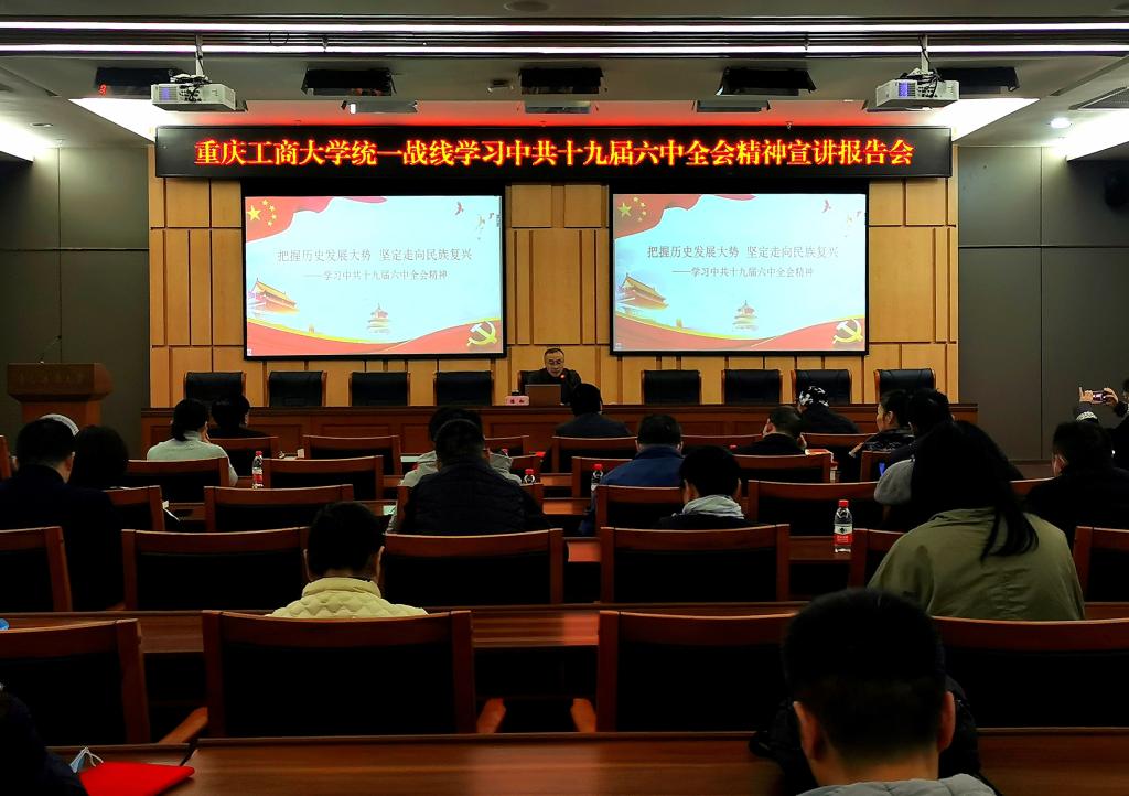 根据学校党委印发的《365英国上市官网关于学习宣传贯彻党的十九届六中全会精神深化拓展党史学习教育的工作方案》的安排,结合学校统一战线开展“学党史、讲《条例》、增合力、促发展”大走访大谈心活动,12月8日下午,学校党委统战部在新图书馆会议中心一会议室举办统一战线学习中共十九届六中全会精神宣讲报告会,各民主党派基层组织和统战团体班子成员及统战成员代表共计50余人参会。