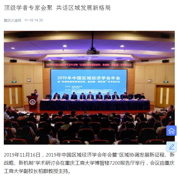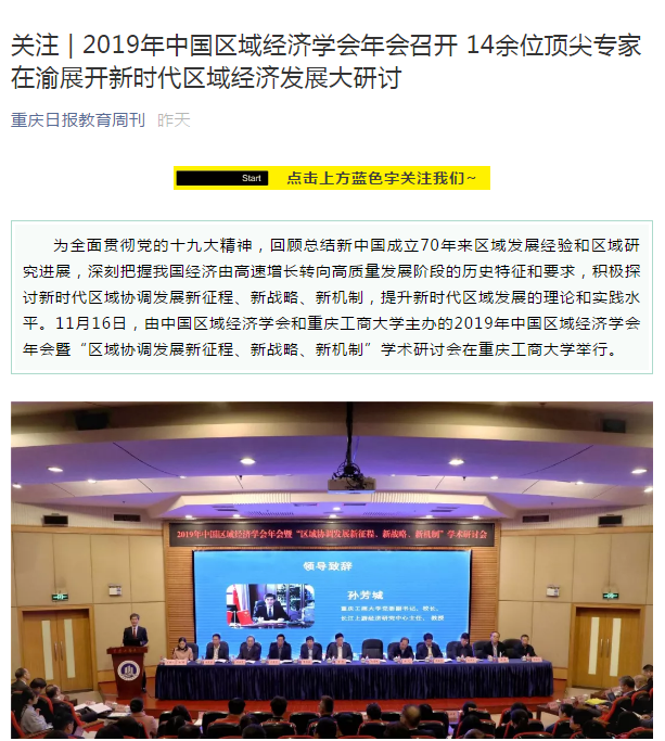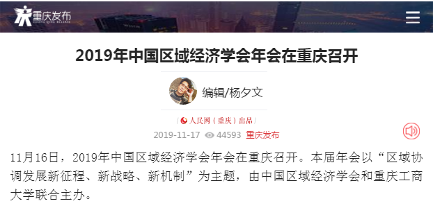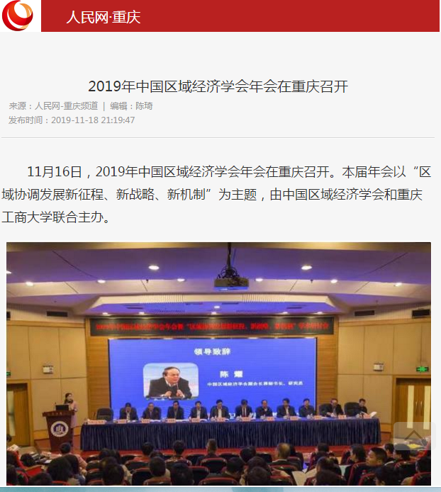 2019年11月15日-16日,2019年中国区域经济学会年会暨“区域协调发展新征程、新战略、新机制”学术研讨会在365官网召开,来自中国社会科学院、武汉大学、四川大学、中央民族大学、湖南大学、西南财经大学、中央财经大学、湖北省社会科学院、河南省社会科学院等各地科研院所、高校、党校行政学院、政府机构和企业的专家学者、政府官员及媒体记者共300多人参加了本次研讨会,并邀请了《中国工业经济》《中国高校社会科学》《改革》《经济学家》《当代经济研究》《财经科学》《经济纵横》《经济与管理研究》《宏观质量研究》《软科学》《经济与管理评论》《区域经济评论》《西部论坛》多家学术期刊参会交流。本次年会由中国区域经济学会、365英国上市官网主办,由教育部人文社会科学重点研究基地365英国上市官网长江上游经济研究中心、重庆市人文社会科学重点研究基地365英国上市官网区域经济研究院、重庆市人文社会科学重点研究基地365英国上市官网产业经济研究院承办,由中国社会科学院西部发展研究中心、重庆市区域经济学会、区域经济评论杂志社、改革杂志社、《西部论坛》编辑部协办。