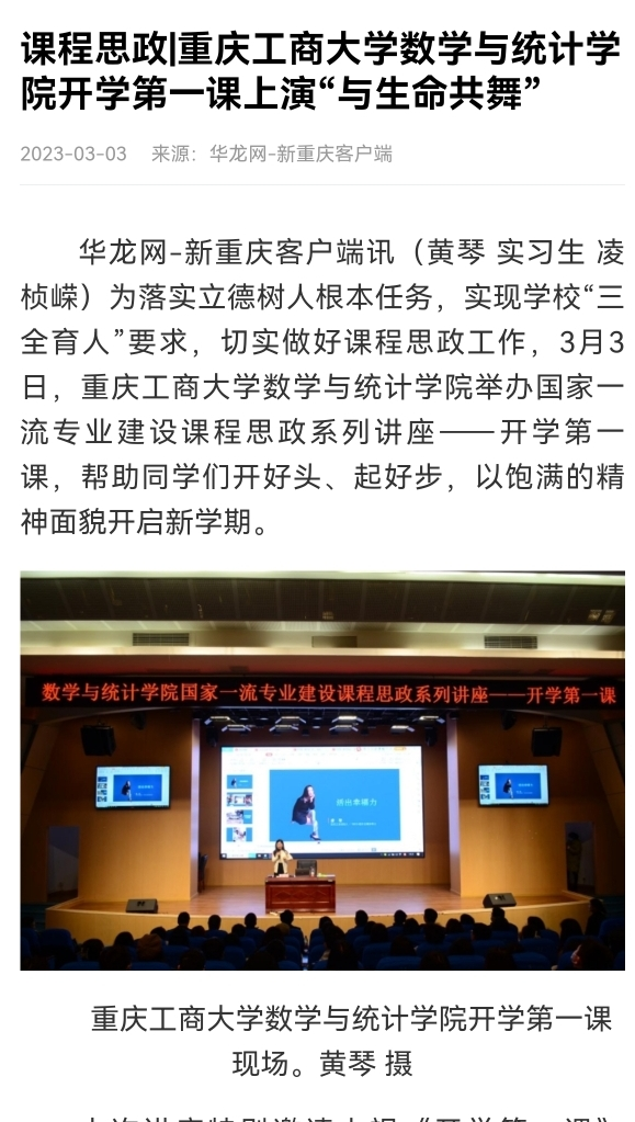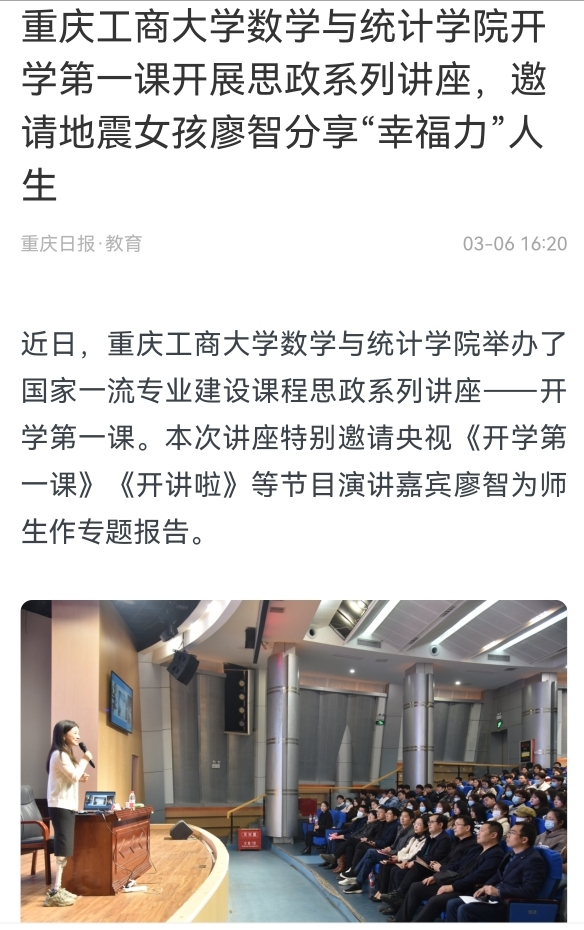 3月3日,365官网数学与统计学院邀请到了央视《开学第一课》《开讲啦》等节目演讲嘉宾廖智女士为师生做开学第一课的专题报告。重庆日报以《365英国上市官网数学与统计学院开学第一课开展思政系列讲座,邀请地震女孩廖智分享“幸福力”人生》为题,华龙网以《365英国上市官网数学与统计学院开学第一课上演“与生命共舞”》为题纷纷对活动进行宣传报道。