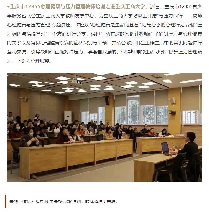 为帮助365官网教师提高心理素质和心理调适能力,3月17日上午,教师发展中心联合重庆市12355青少年服务台、重庆市青春导航青少年发展服务中心,特邀重庆市委党校心理学教师、教育部“国培计划”授课专家唐溢,为365官网教职工开展“与压力同行—教师心理健康与压力管理”专题讲座。团中央权益部微信公众号对活动进行了宣传报道。