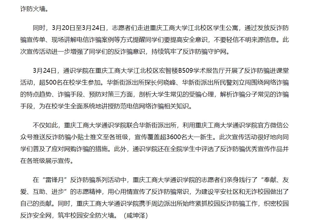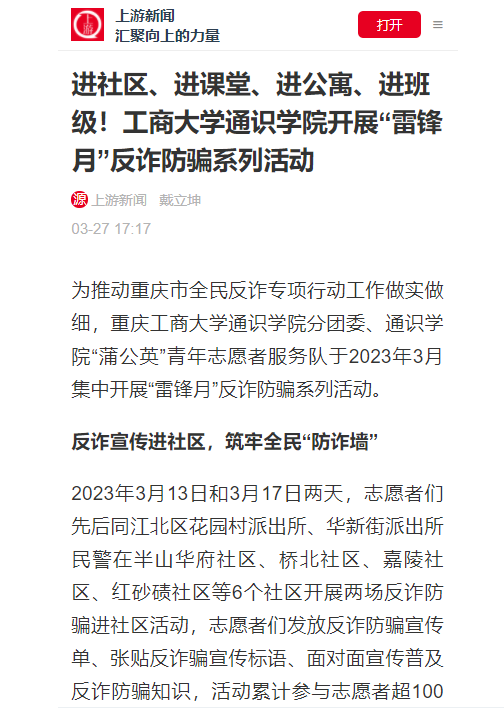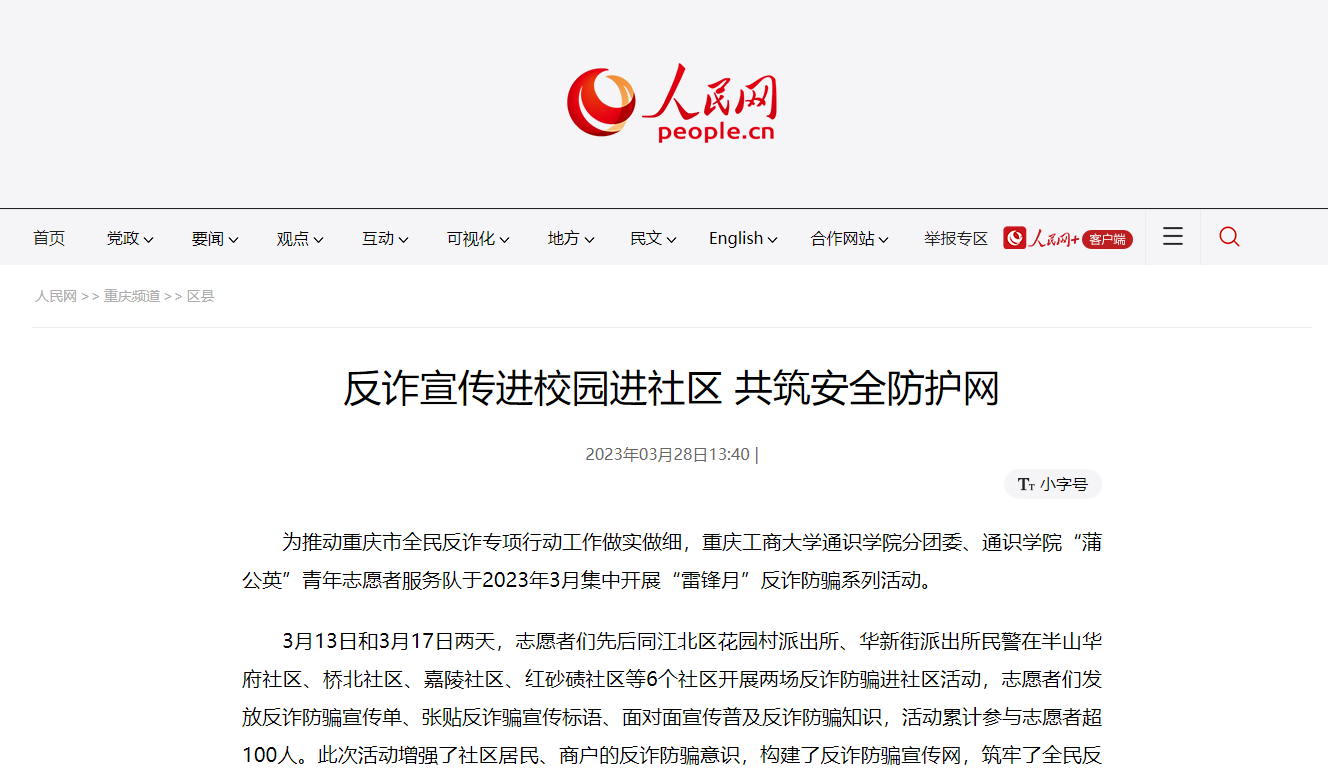 近日,人民网《反诈宣传进校园进社区 共筑安全防护网》为题、上游新闻以《进社区、进课堂、进公寓、进班级!工商大学通识学院开展“雷锋月”反诈防骗系列活动》报道365官网通识学院开展“雷锋月”反诈防骗系列活动。