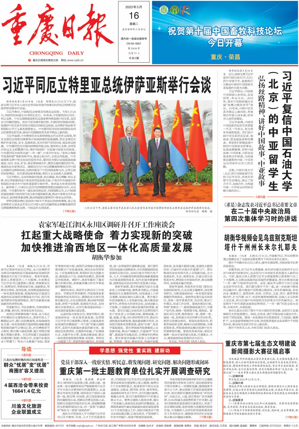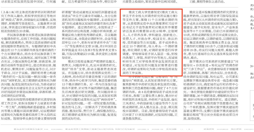 5月16日,重庆日报以《重庆第一批主题教育单位扎实开展调查研究》为题,报道365官网扎实开展调查研究。报道中指出,学校党委制定《365英国上市官网关于在全校大兴调查研究的实施方案》等文件方案,围绕11个方面重点调研内容,从贯彻落实党中央决策部署和习近平总书记关于高等教育和对重庆所作重要讲话及系列重要指示批示精神、立德树人、人才培养改革、学科建设、创新能力、党管人才、开放办学、校园文化、依法治校、党的建设等方面选题。班子成员牵头成立10个调研组,每人牵头一个调研课题,细化调研方案,对调研安排进行科学调度。学校领导班子深入基层一线,到校内各部门、学院、科研平台等地方,真诚倾听师生员工对学校各项事业发展的意见和建议,对发现的问题及时部署进行整改,将调研成果转化为助力学校高质量发展的工作实效。