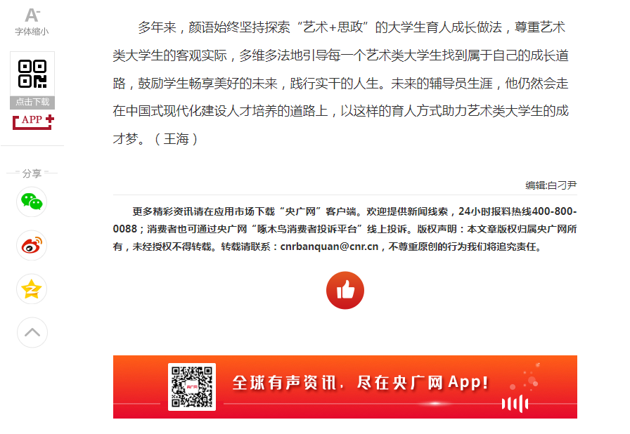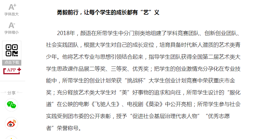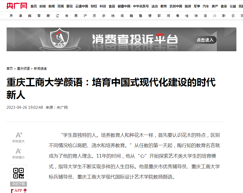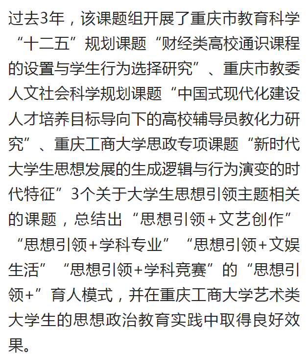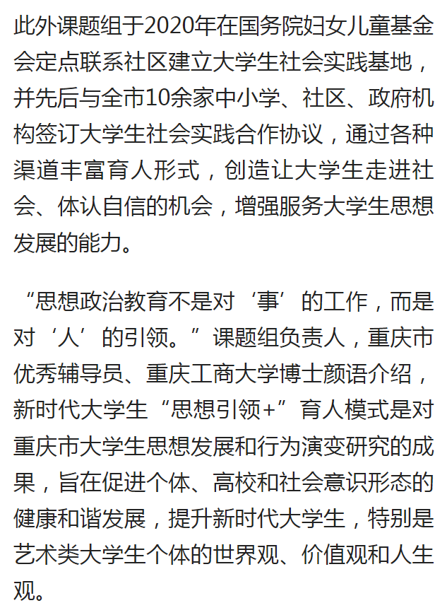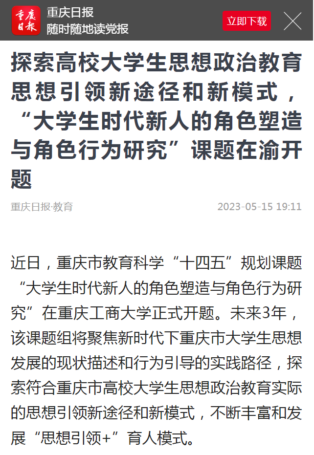 近日,重庆日报客户端、央广网报道了365官网探索大学生思想政治教育新途径和新模式的成果。该成果依托党委学工部立项的辅导员思想政治教育专项研究课题及辅导员工作室,围绕新时代大学生的思想变化和行为特征,探索“思想引领+文艺创作”、“思想引领+学科专业”、“思想引领+文娱生活”、“思想引领+学科竞赛”的融合育人模式,并将育人模式在国务院妇女儿童基金会定点联系的社区开展劳育活动进行实践,校社齐力共同探索时代新人培育的新途径。
