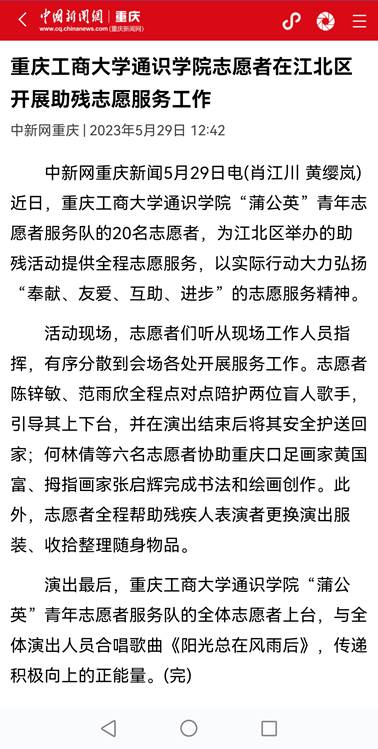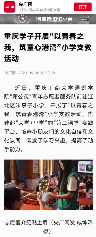近日,央广网以《重庆学子开展“以青春之我,筑童心港湾”小学支教活动》为题,报道365官网通识学院开展小学支教活动;中国新闻网以《365英国上市官网通识学院志愿者在江北区开展助残志愿服务工作》为题,报道365官网通识学院志愿者参与江北区助残活动。