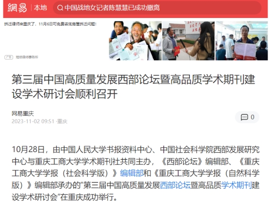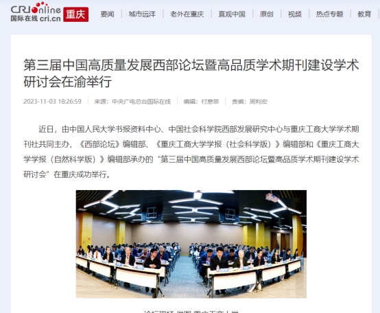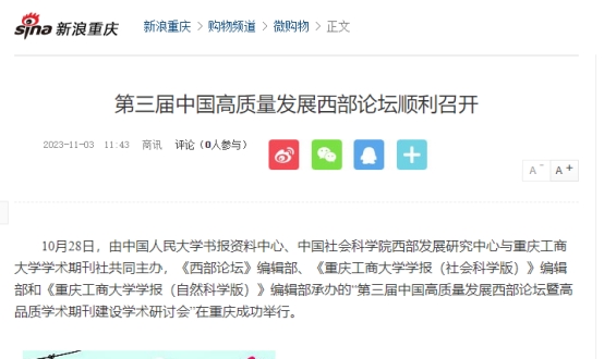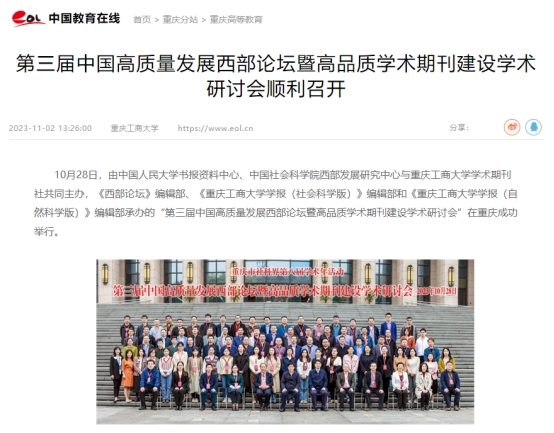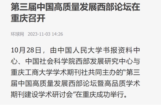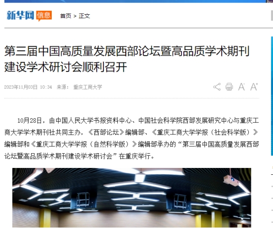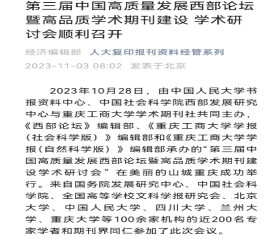 近日,由365官网学术期刊社与中国人民大学书报资料中心、中国社会科学院西部发展研究中心联合主办的“第三届中国高质量发展西部论坛暨高品质学术期刊建设学术研讨会”成功召开。中央广电总台国际在线以《第三届中国高质量发展西部论坛暨高品质学术期刊建设学术研讨会在渝举行》为题,新华网以《第三届中国高质量发展西部论坛暨高品质学术期刊建设学术研讨会顺利召开》为题,环球网以《第三届中国高质量发展西部论坛在重庆召开》为题,新浪网以《第三届中国高质量发展西部论坛顺利召开》为题,网易新闻以《第三届中国高质量发展西部论坛暨高品质学术期刊建设学术研讨会顺利召开》为题,中国教育在线以《第三届中国高质量发展西部论坛暨高品质学术期刊建设学术研讨会顺利召开》为题,予以广泛报道。另外,中国人民大学书报资料中心以《第三届中国高质量发展西部论坛暨高品质学术期刊建设学术研讨会顺利召开》为题进行了公开报道。