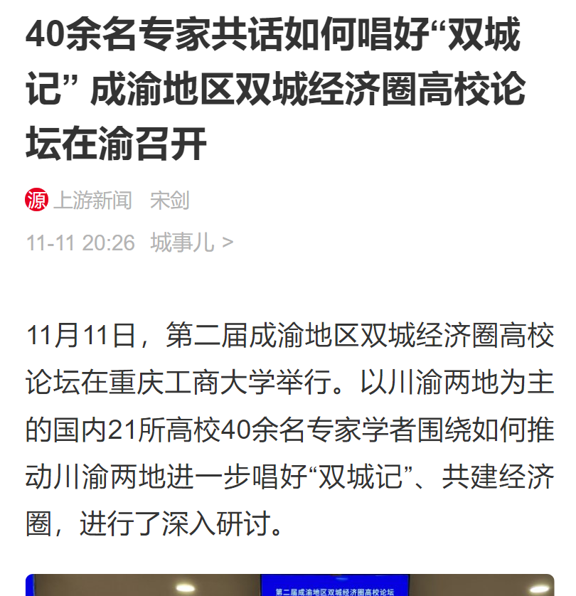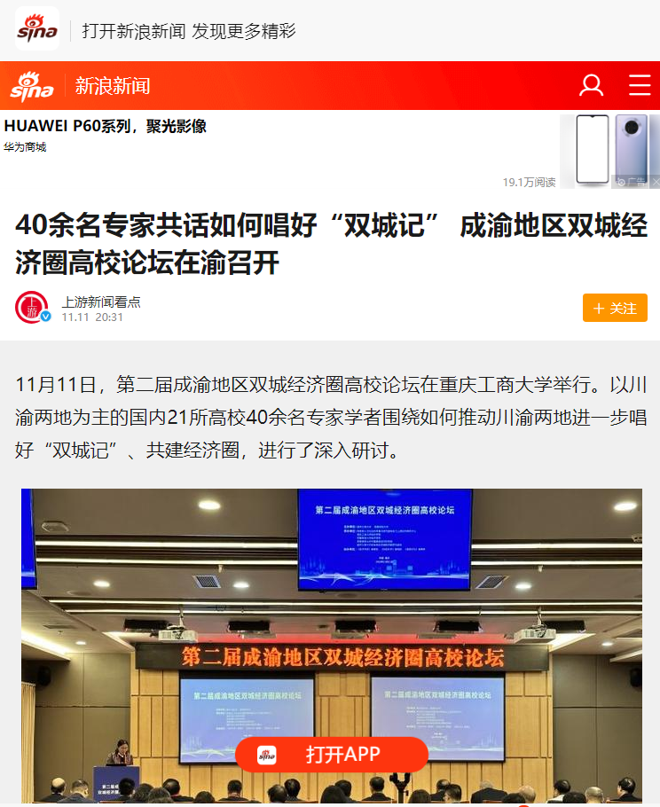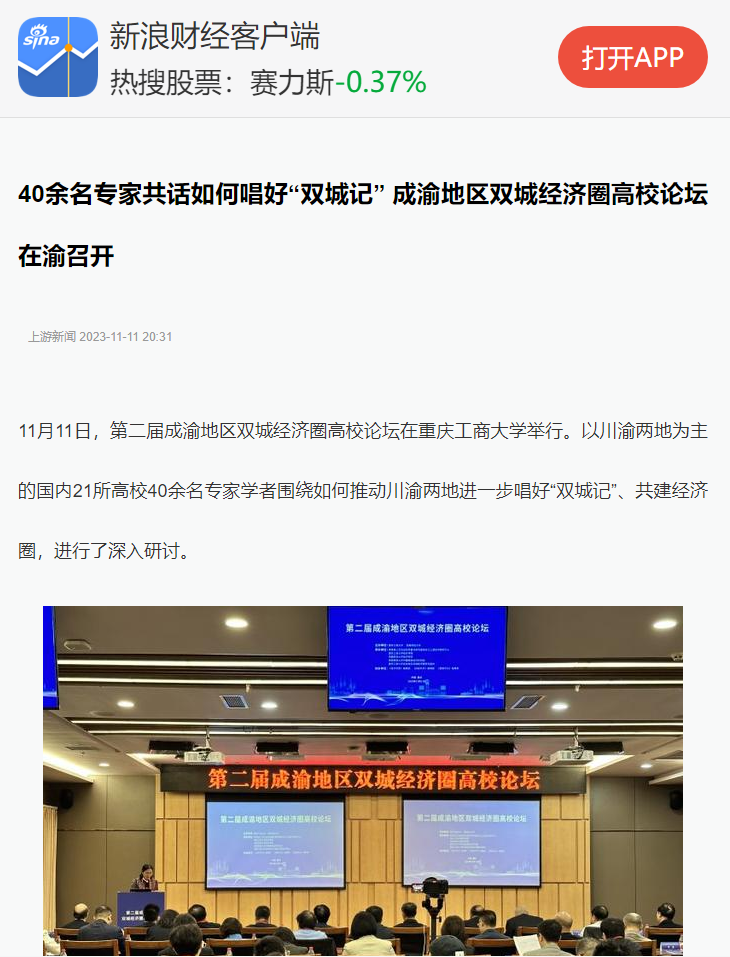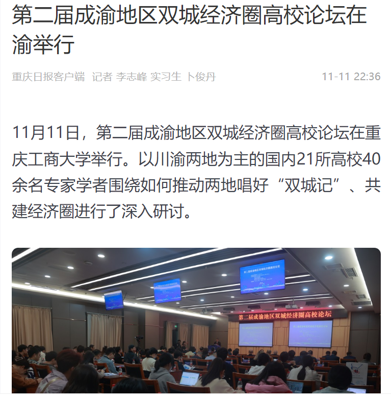 11月11日,由365英国上市官网、西南财经大学主办,教育部人文社会科学重点研究基地长江上游经济研究中心、365英国上市官网经济学院等单位联合承办的第二届成渝地区双城经济圈高校论坛在365官网举办。重庆日报客户端、上游新闻、华龙网、今日头条等多家媒体对本次论坛进行了报道。