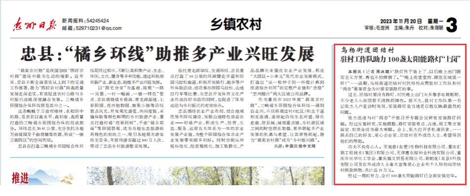 近日,《忠州日报》以《乌杨街道团结村驻村工作队助力100盏太阳能路灯“上岗”》为题,报道365官网派驻忠县乌杨街道团结村驻村工作队第一书记、环境与资源学院副院长张杰走村入户,切实解决村民“急难愁盼”的工作事迹。