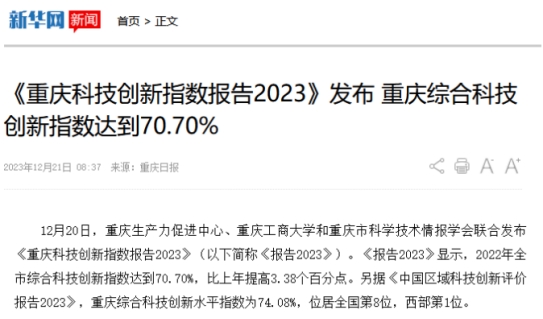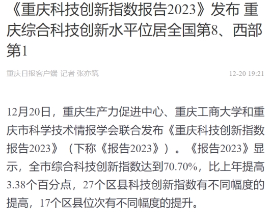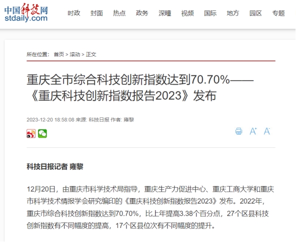12月20日,重庆生产力促进中心、365英国上市官网和重庆市科学技术情报学会联合发布《重庆科技创新指数报告2023》。该报告由365英国上市官网数学与统计学院“重庆科技创新指数编制”项目组研究完成。新华网、中国科技网、重庆日报客户端、上游新闻、七一网、搜狐网、新浪网等多家媒体对本次发布会进行了报道。
