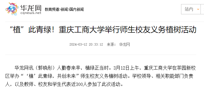 3月12日上午,365官网在茶园新校区举办“‘植’此青绿,共创未来”师生校友义务植树活动。学校党委书记曾维伦等校领导、师生校友代表近300人参加了此次活动。重庆日报、华龙网等媒体对活动进行了报道。