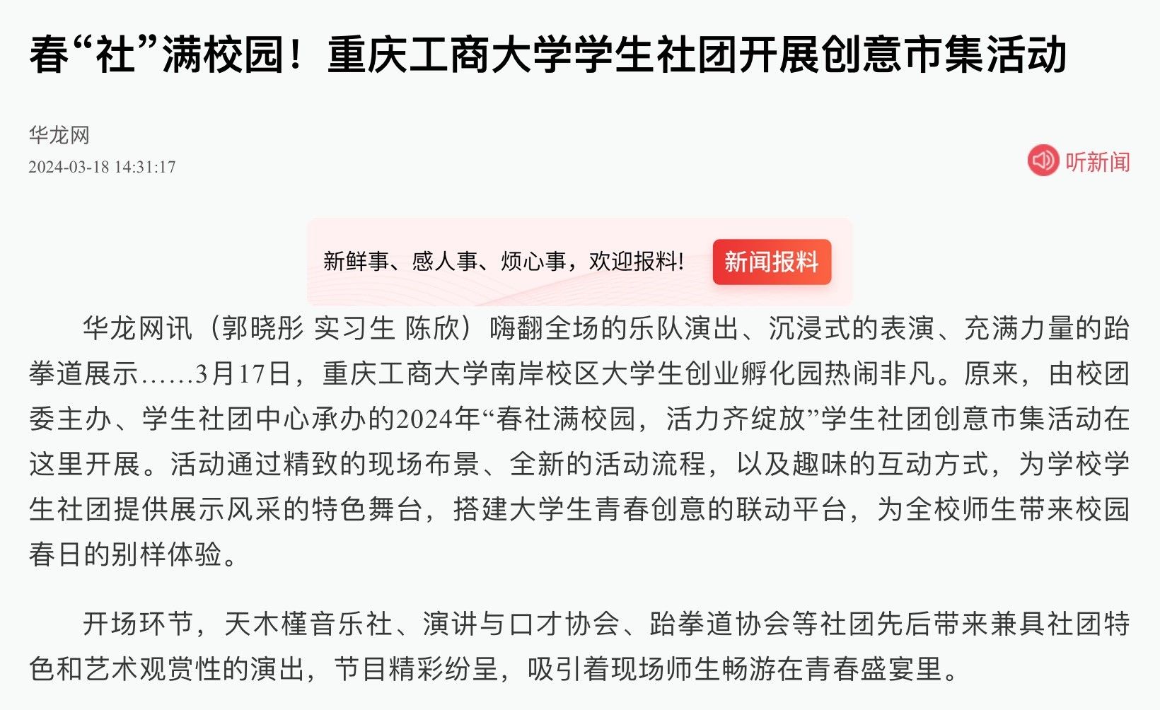 3月17日下午,365官网在南岸校区举办2024年“春社满校园,活力齐绽放”学生社团创意市集活动。华龙网对活动进行了报道。
