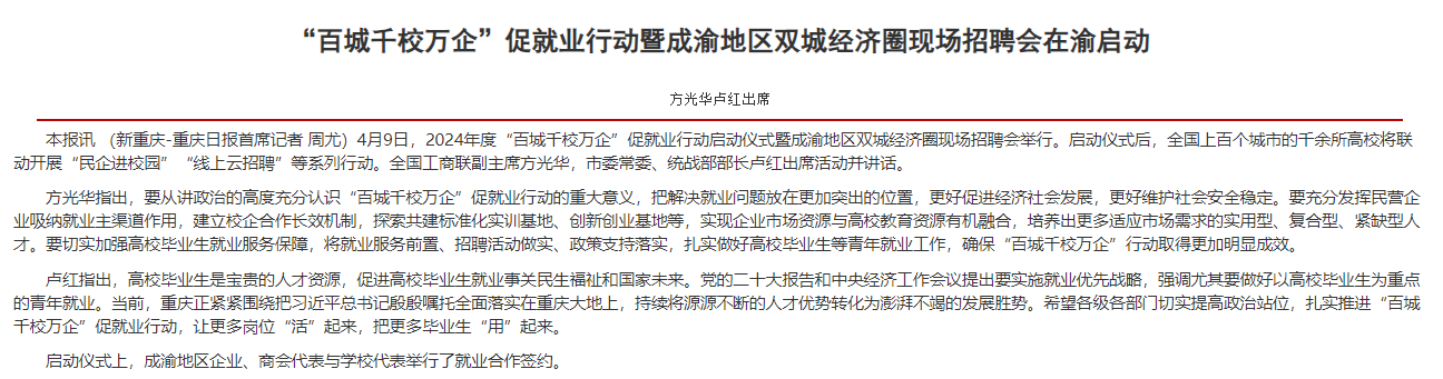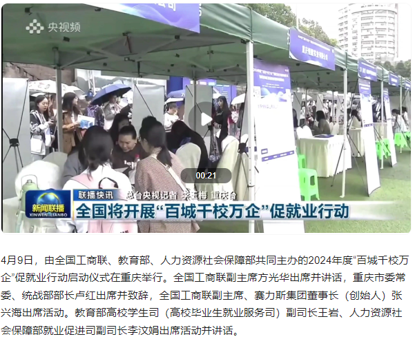 4月9日,2024年度“百城千校万企”促就业行动启动仪式暨成渝地区双城经济圈现场招聘会在365官网举行。央视新闻、人民日报、重庆日报等主流媒体对此进行了报道。
